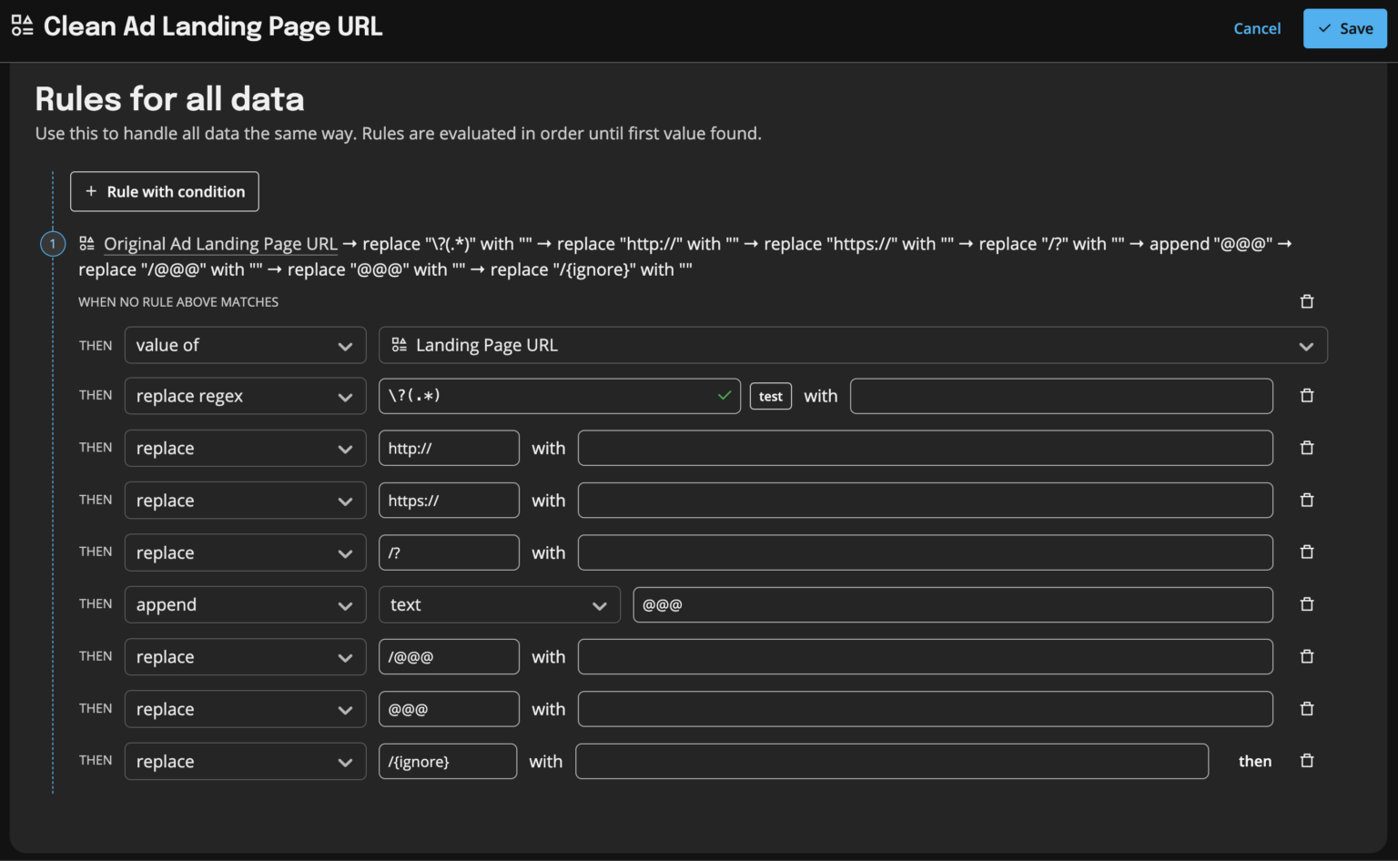In Funnel, we created a custom dimension called “Clean Ad Landing Page URL“: