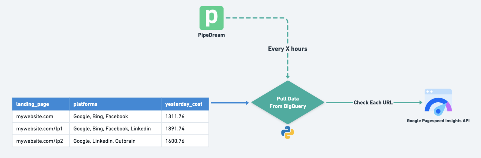 - Iterate through each “landing_page” and check its validity using Google’s Pagespeed Insights API.