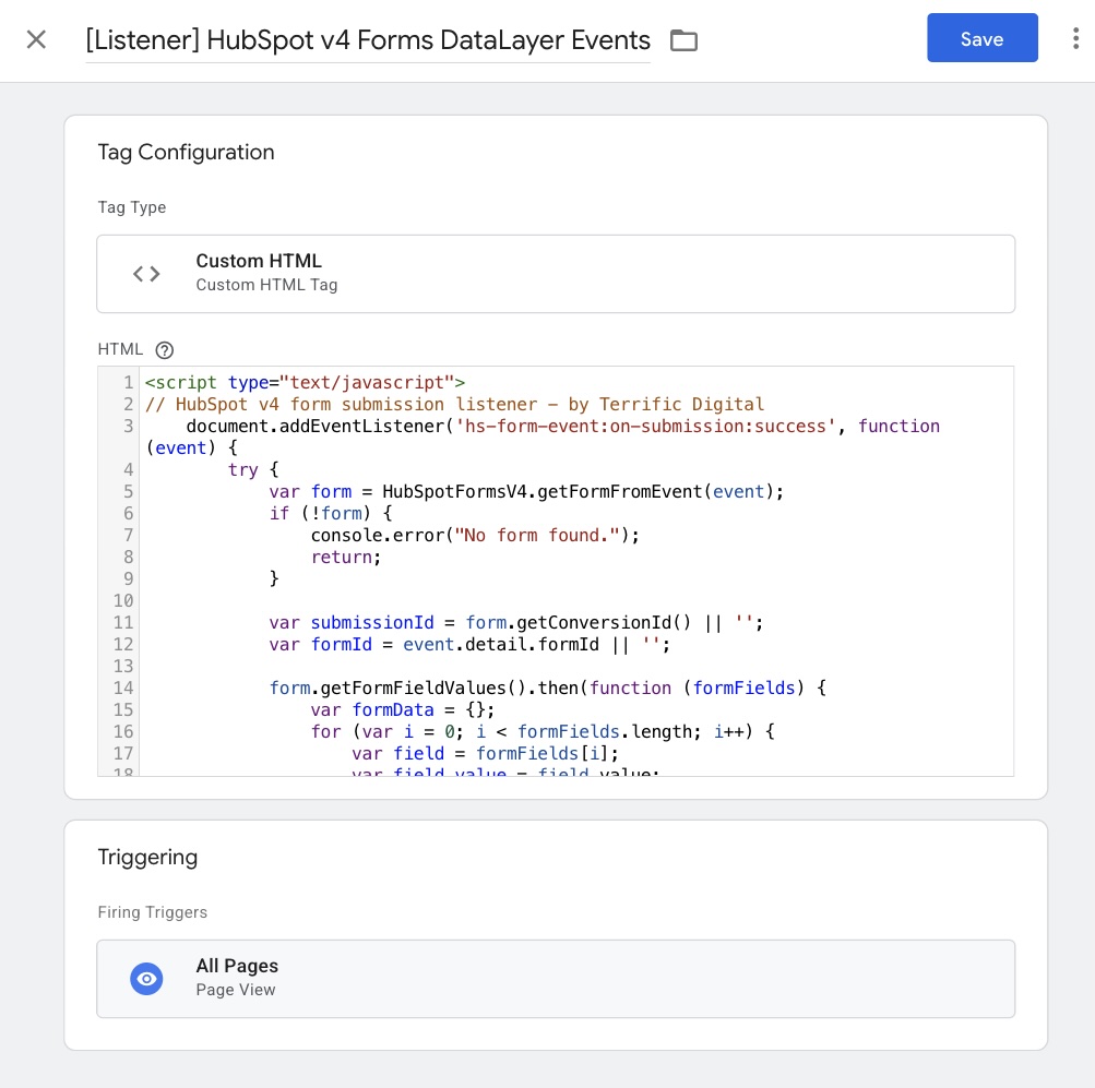- Name it something along the lines of: “[Listener] HubSpot v4 Forms DataLayer Events“.